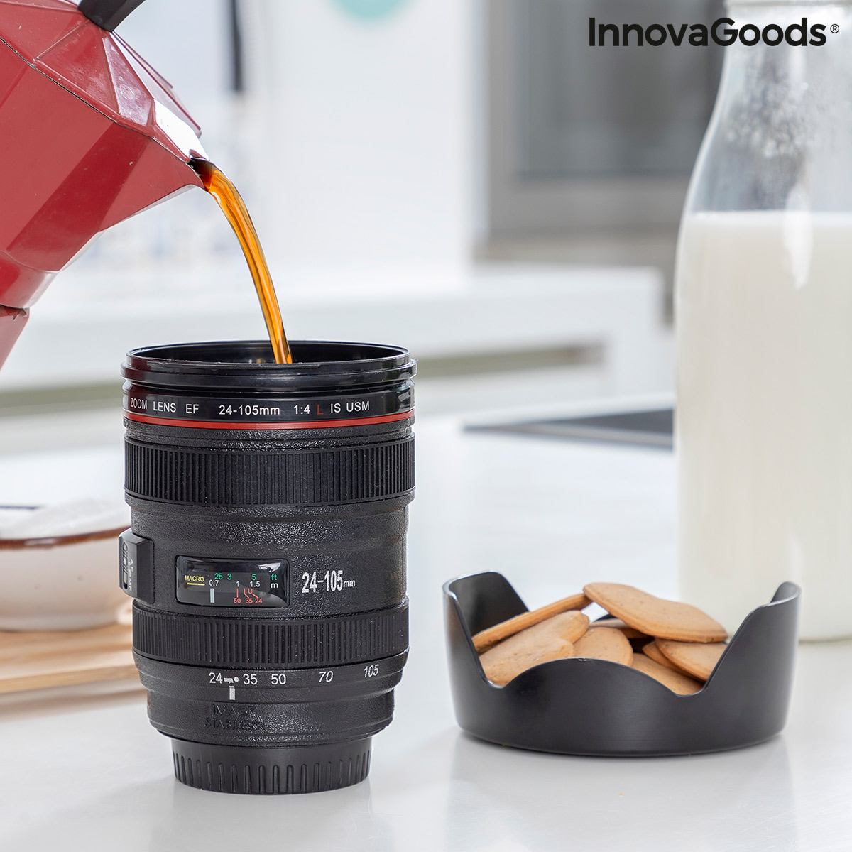 Večnamenska skodelica MukoffyInnovaGoods s pokrovom izstopa po zabavnem dizajnuv obliki leče kamere. Ta izvirna večnamenska skodelica je zelovsestranska, saj se lahko uporablja tudi kot dekorativni element, kot je vazaali lonček za rože ali rastline, kot organizator za shranjevanje številnihpredmetov itd. Praktična skodelica s pokrovom, ki je idealna za udobnonošenje kamor koli.